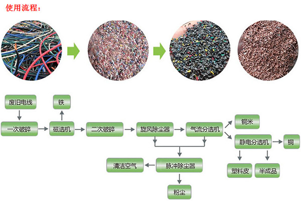 8、加工过程中主要步骤是废线缆在加工中切碎和研磨,塑料皮和铜颗粒混合物料分离;